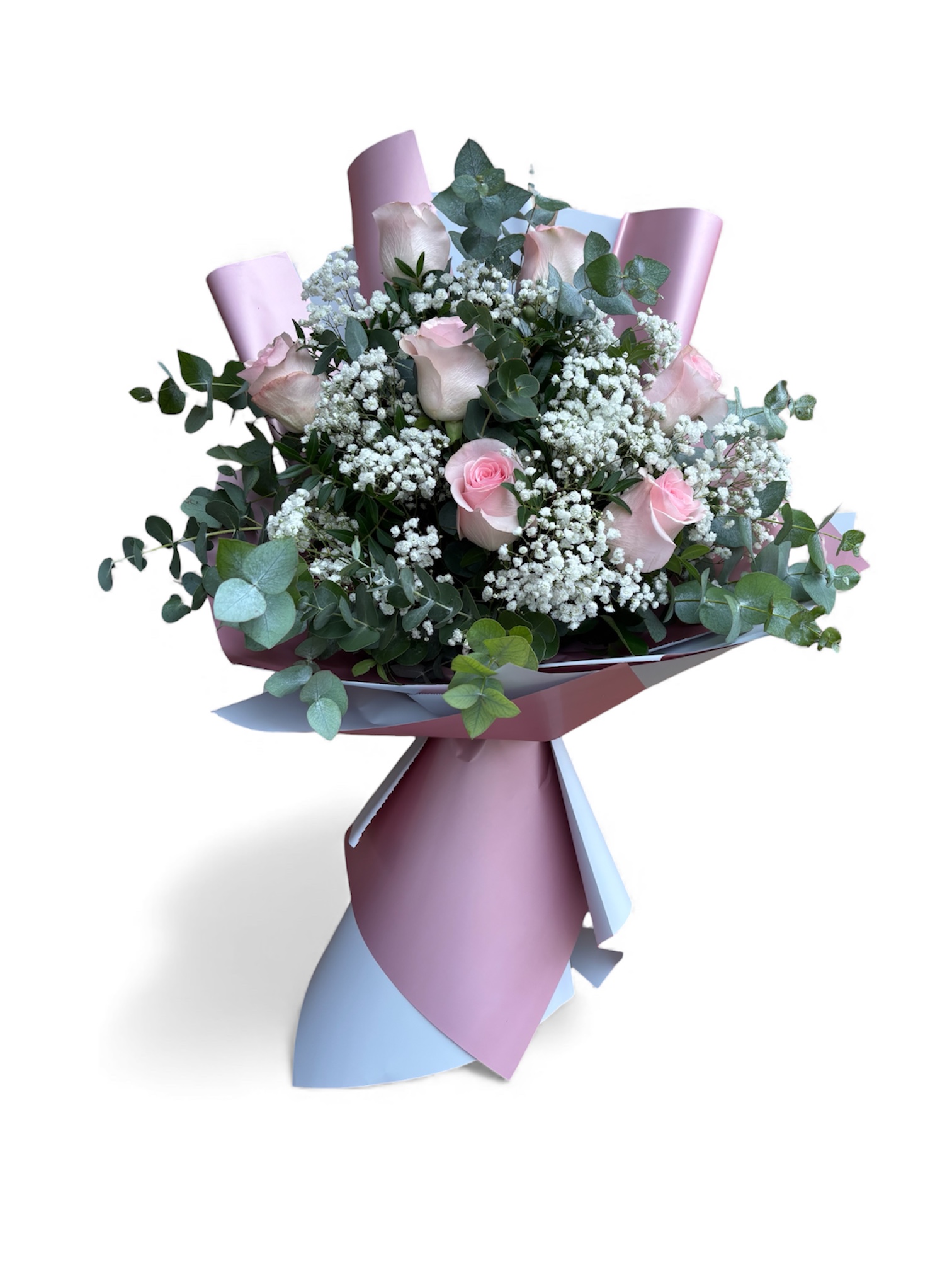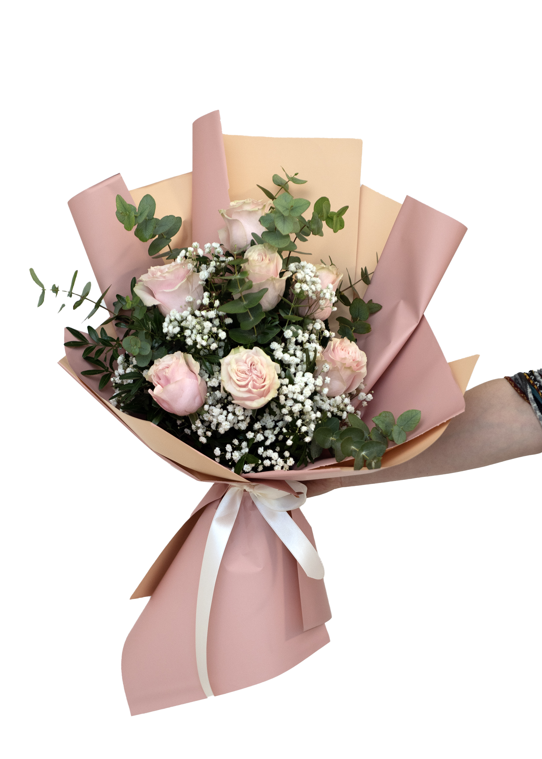A timeless arrangement of 7 pink roses paired with delicate baby’s breath and lush greenery, wrapped in elegant blush-toned paper. This bouquet exudes romance and grace, making it perfect for anniversaries, birthdays, or simply to show someone you care. Handcrafted with a touch of sophistication, it’s a gift that speaks volumes without saying a word.